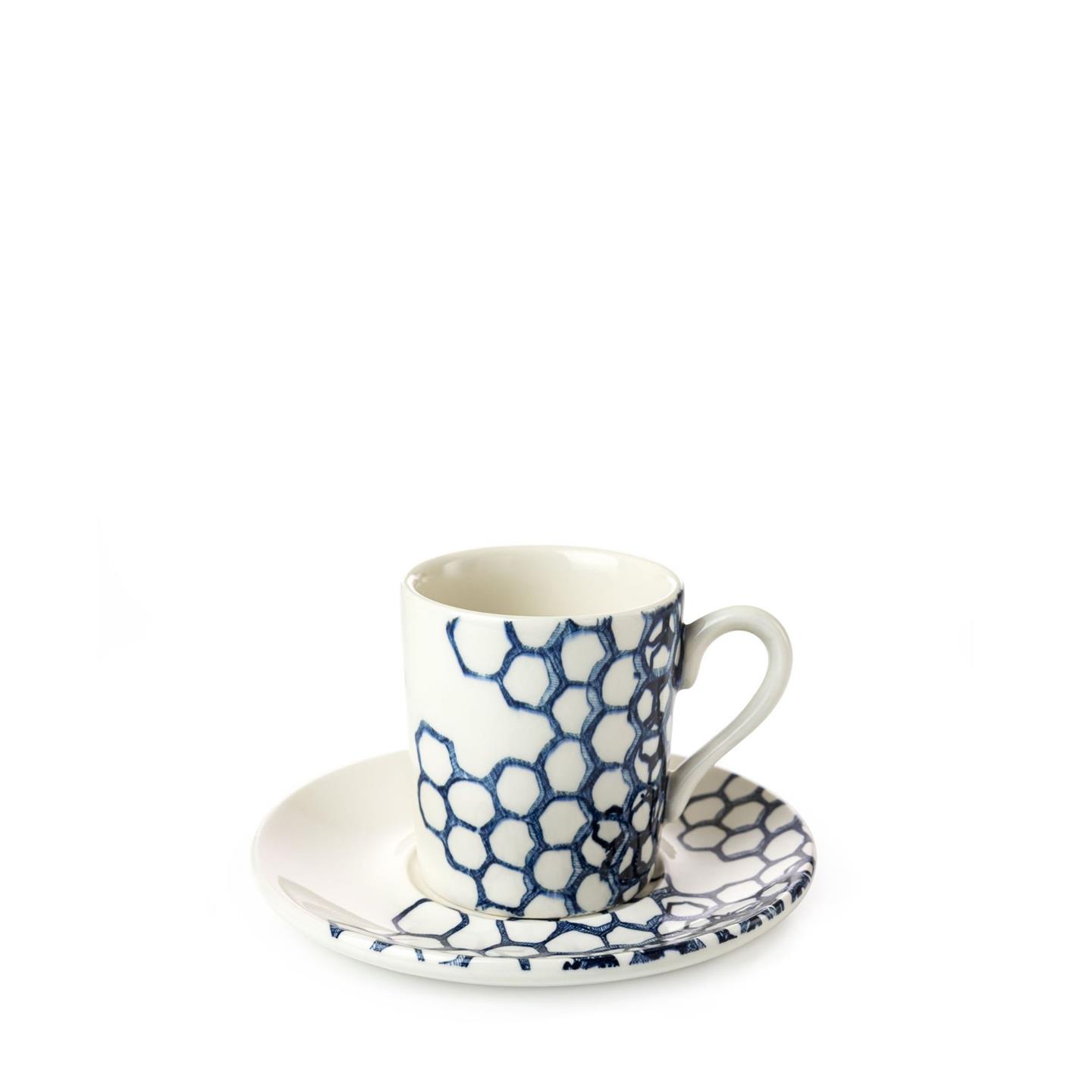 Blue Pollen dinnerware has a geometric honeycomb backdrop interspersed with bees, the great symbol of industry. The significance of this pattern is that the layout of each item differs and is asymmetrical, as the exact position of the pattern is in the hands of our skilled tissue transfer decorators. Each bee is placed according to the whim of the decorator, emphasizing the hand decoration method and imbuing each piece with energy and personality.