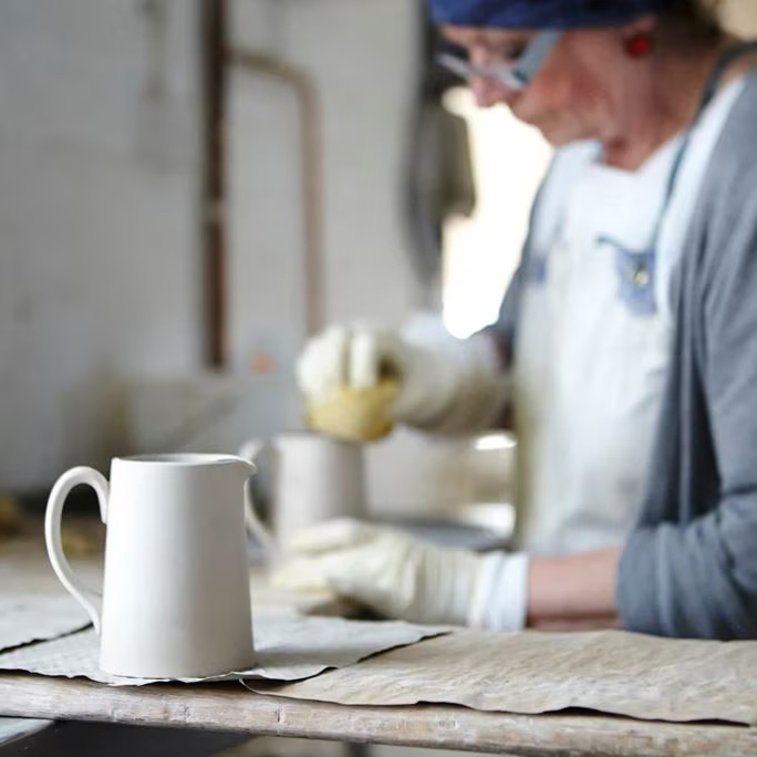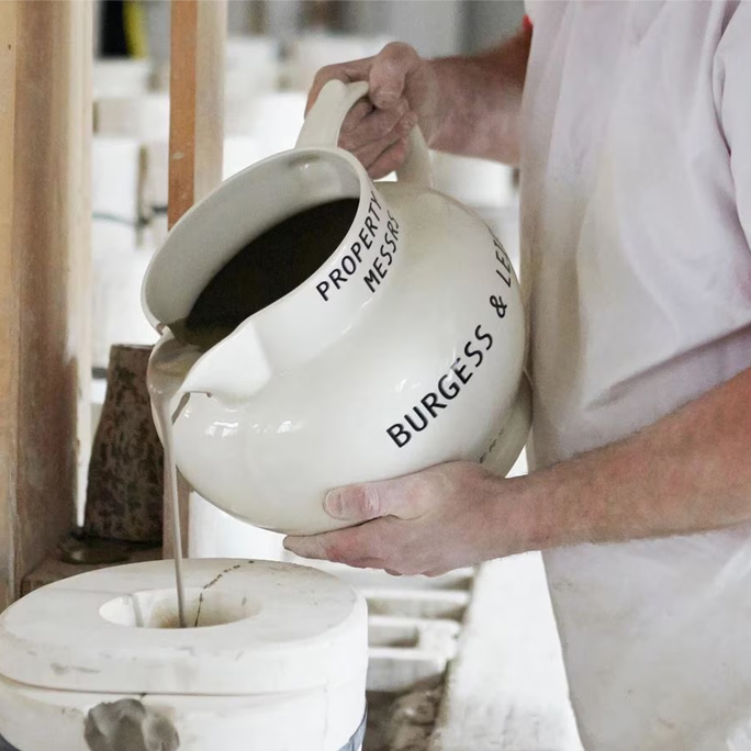 The first step of our craft is to process the clay from raw ingredients, using original 19th century machinery, to make malleable ‘plastic’ clay and liquid clay called ‘slip’. The malleable clay can then be pressed into shape to make flatware items, such as plates and bowls. The liquid clay is poured into plaster moulds to form more complex ‘holloware’ shapes, such as teapots. Next, the dried clay is carefully sponged and fettled to smooth over the surface.