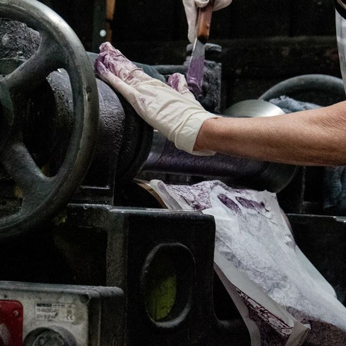 Our pottery has been hand decorated in the same way for 200 years, using the skilled technique of tissue transfer printing. We are the last pottery in the world to use this traditional practice, which forms an entirely unique and beautiful finish, attainable only to Burleigh. This intricate decorating process begins with printing from an engraved copper roller onto very fine tissue paper. The paper rolls off the printing machine in continuous sheets, which are ripped to size by our highly skilled printer. She then hangs each print on a line and sends it down the room to waiting transferrers. Each transferrer then expertly hand cuts each design to size and places onto biscuitware shapes.