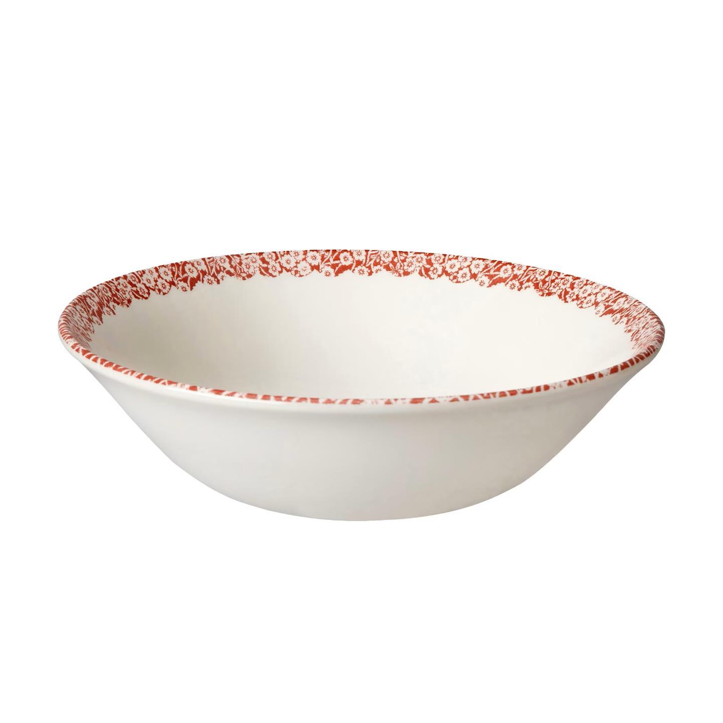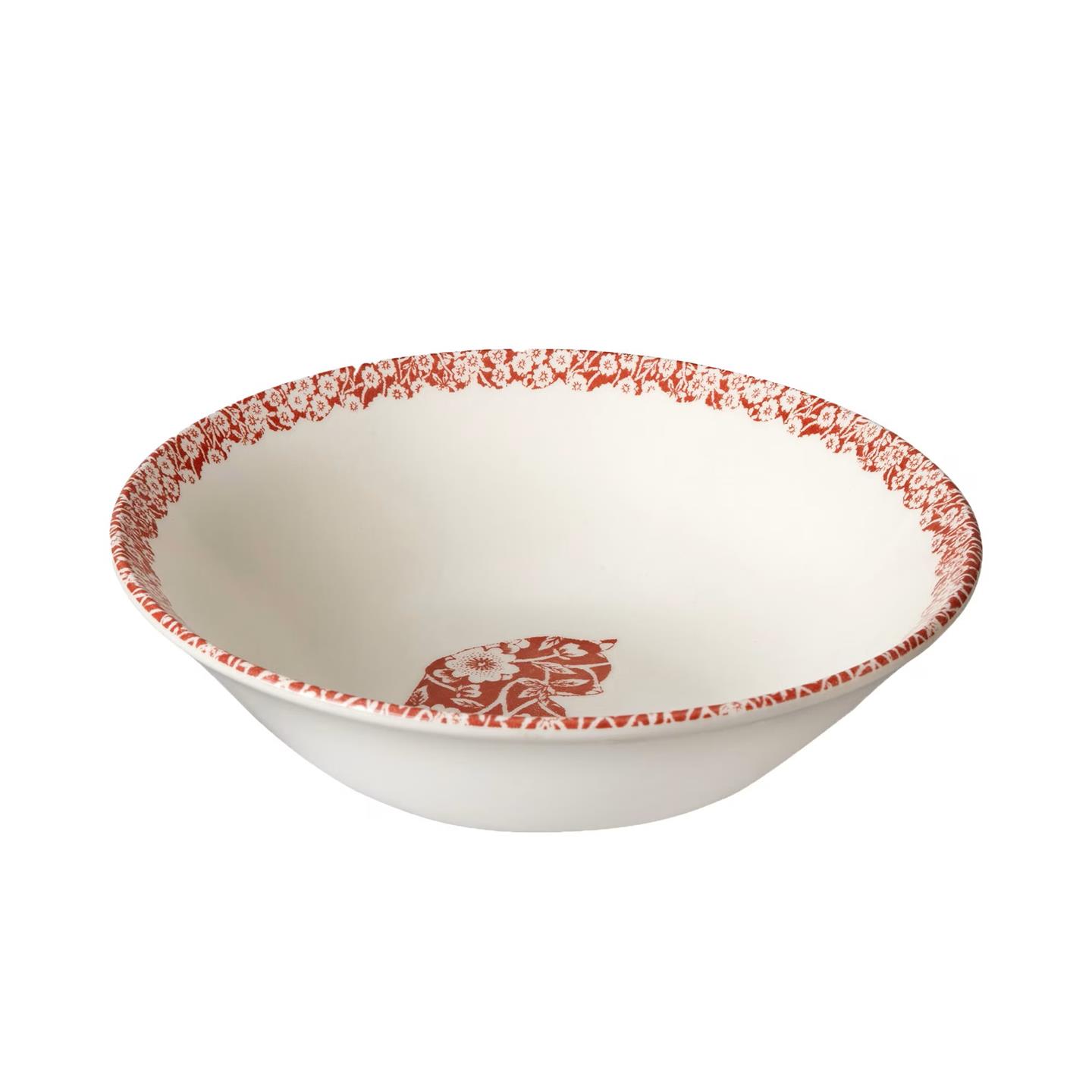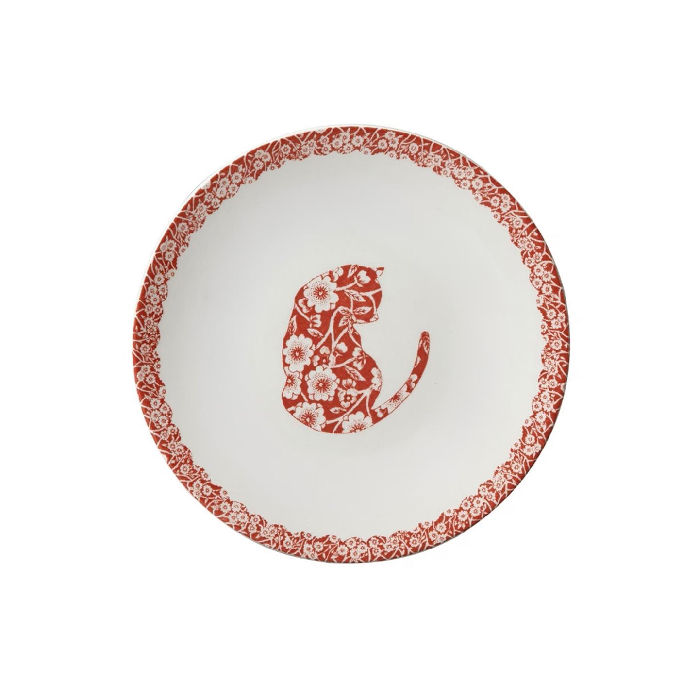 The Red Calico Cat Cereal Bowl brings warmth and charm to your table with its intricate floral design in a striking red hue. Handcrafted with care, this bowl is perfect for breakfast, soups, or desserts. Also use as a pet bowl for your furry friends. Handmade in Middleport Pottery, England. Uniquely decorated by skilled craftsmen with Burleigh's centuries-old technique of tissue transfer printing from hand-engraved copper rollers.